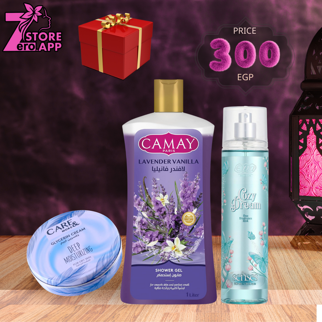 ١- كامي شاور جيل لافندر فانيليا ١ لتر ٢- ايفا سكين معطر للجسم كوزي دريم ٢٤٠ مل ٣- كير اند مور كريم بشرة جافة ٧٥ مل