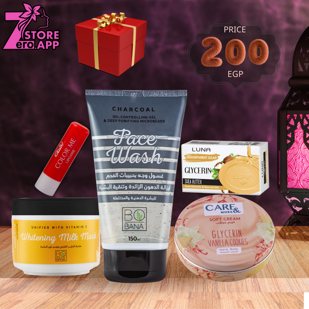 ١-بوبانا غسول فحم ١٥٠ مل ٢- كير اند مور كريم بشره فانيليا ٧٥ مل ٣-لونا صابون جلسرين ٧٠ جم ٤-بوبانا ماسك الحليب فيتامين سى برطمان ٢٥٠جم ٥-تشاو زبدة كاكاو فراولة