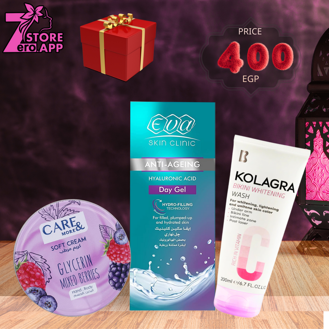 ١-كولاجرا غسول تفتيح المناطق الحساسة ٢٠٠ مل ٢- كير اند مور مرطب للجسم بالتوت ١٥٠ مل ٣- ايفا سكين كير مقشر للقدمين ٦٠ مل
