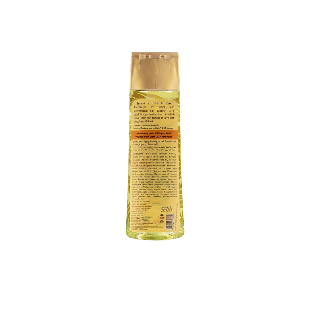 يمكن للشمس والتلوث والمعالجة الكيميائية أن تلحق الضرر بشعرك مما يجعله لا يمكن التحكم فيه. امامي 7 Oils in One هو مزيج فريد من نوعه من زيت الأرغان والجوز واللوز والجوجوبا والزيتون وجوز الهند وزيت الأملا. غني بقوة 7 أوشاد - جابا بوشبا وبراهمي وبهرنجاراج وميهندي والأرنيكا ولاتا كاستوري وميثي - زيت الشعر هذا يجعل الشعر أقوى بمقدار 20 مرة. يخترق هذا الزيت المعجزة جذور الشعر الجاف والتالف للحصول على تغذية عميقة قبل الاستحمام مع المساعدة في تصفيف الشعر بعد الاستحمام. تركيبة خفيفة وغير لزجة مع عطر خفيف وممتع مناسب لجميع أنواع الشعر.