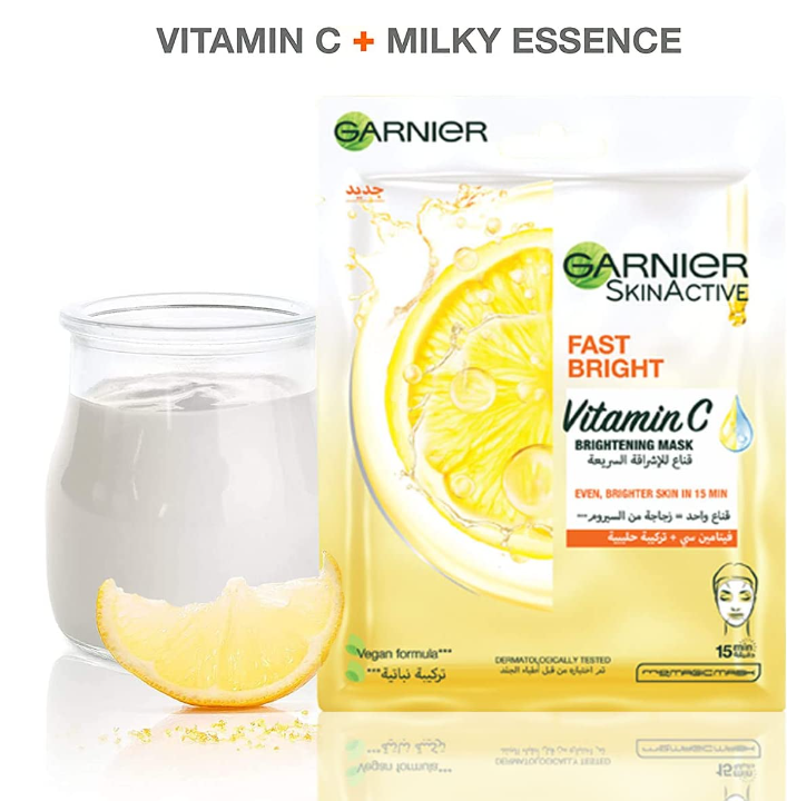 غارنيه قناع ورقي للوجه بالحليب وفيتامين سي سكين أكتيف 28 جرام هو منتج للعناية بالبشرة يحتوي على مكونات مفيدة لترطيب وتغذية البشرة وتحسين مظهرها بشكل عام، بما في ذلك فيتامين C والحليب.