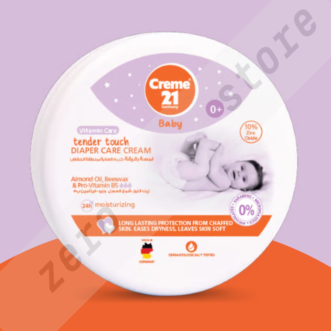 كريم العناية بالحفاضات بيبي تيندر تاتش من كريم 21 هو كريم حفاضات مصنوع في ألمانيا مثبت سريريًا لترطيبه لمدة 24 ساعة ويساعد على منع البلل وحماية بشرة الطفل من التهيج والاحتكاك. غني بفوائد فيتامين B5 وشمع العسل وزيت اللوز الذي يشكل طبقة مزدوجة من التغذية والحماية.