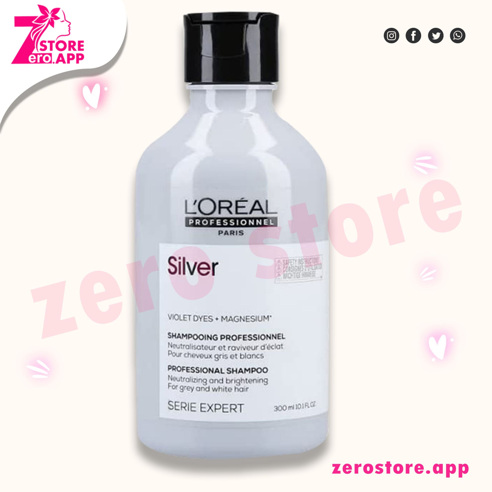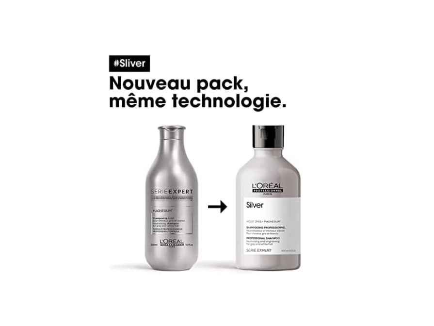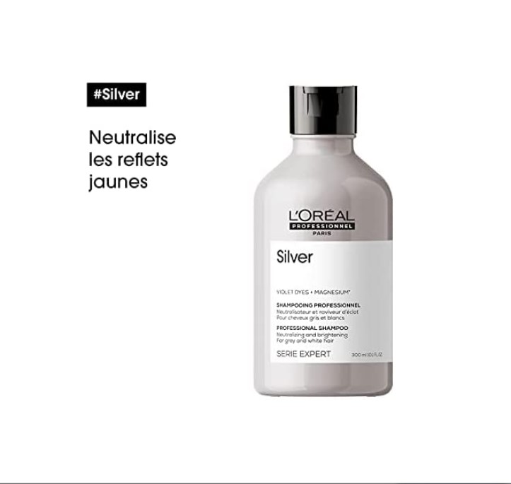 • لوريال بروفيشنال شامبو فضي احترافي هو منتج تجميلي للشعر يستخدم للعناية بالشعر الأشقر والرمادي والأبيض، ويساعد على إزالة اللون الأصفر غير المرغوب فيه وتحسين لون الشعر الفضي أو الرمادي.