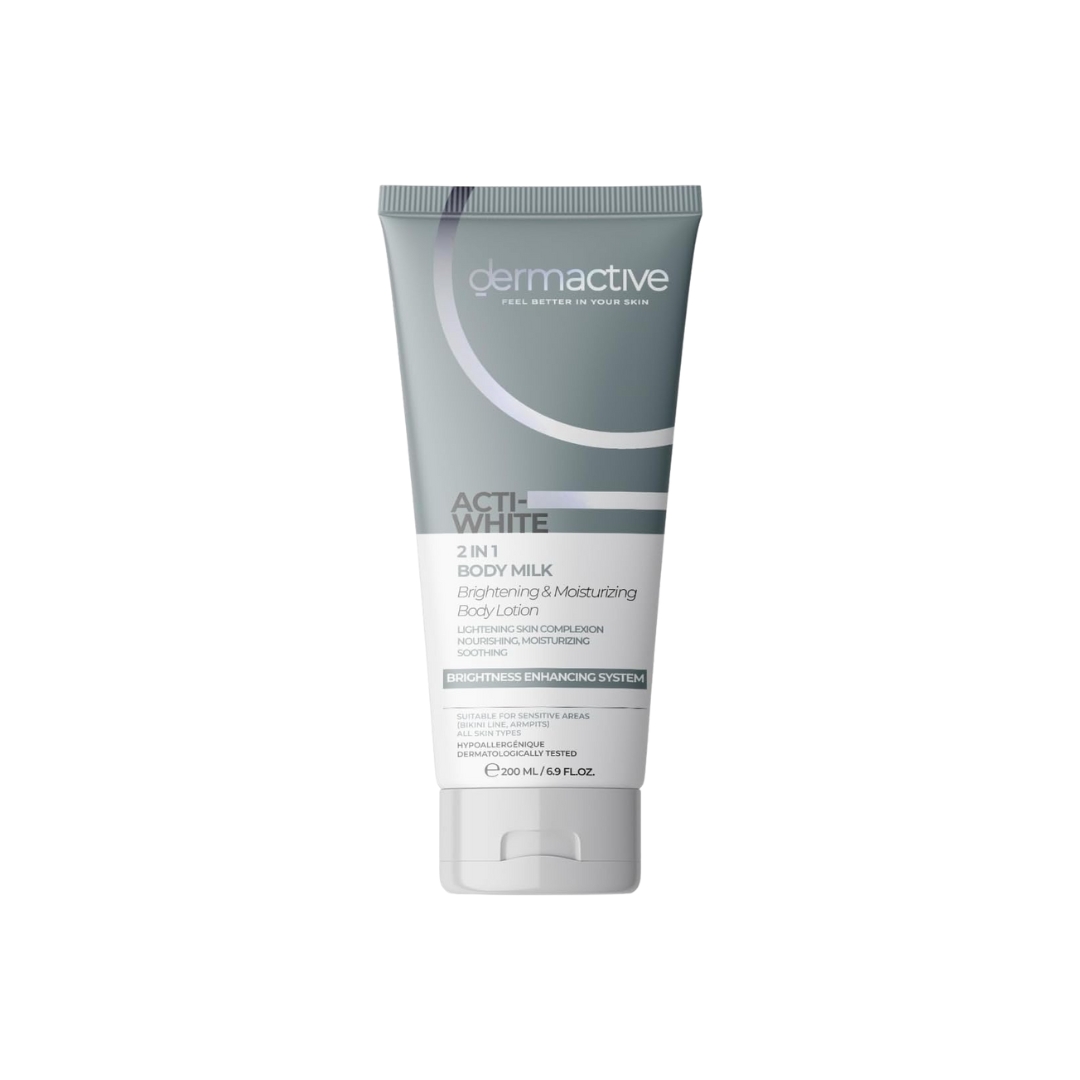 ديرماكتيف أكتي-وايت هو حليب للجسم 2 في 1 تم تركيبه خصيصًا لتنعيم وتوحيد وإشراق لون البشرة في المناطق الحساسة والحميمة مثل خط البيكيني والإبطين. يقلل هذا المنتج بشكل فعال من ظهور البقع الداكنة الناتجة عن الاحتكاك. تركيبته اللطيفة تترك البشرة ناعمة ومريحة وغير دهنية، مما يجعلها آمنة للاستخدام في المناطق الحساسة. الفوائد الرئيسية: - يعمل حليب الجسم هذا على تهدئة وتقليل اختلاف اللون في المناطق الحساسة والحميمة. - يعمل على تفتيح البشرة وتوحيدها بنتائج دائمة. - يرطب البشرة على الفور ويترك البشرة ناعمة ومريحة بفضل قوامها الناعم الغني غير الدهني. تحمل جيد جدًا. كيفية الاستخدام: يوضع مرة أو مرتين يوميًا على المنطقة المصابة.